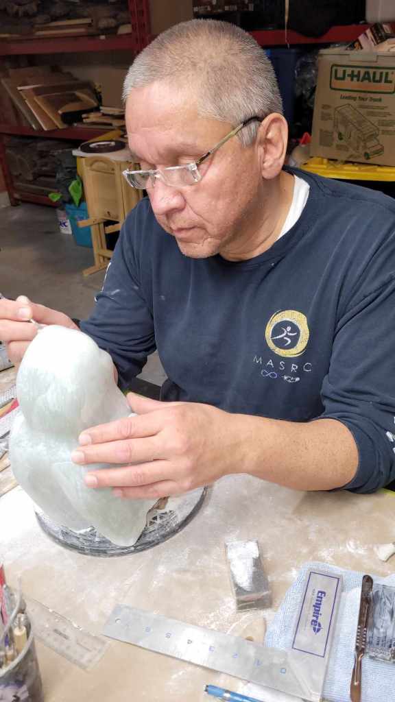 Peter Symchuk was born in 1963 in The Pas, Manitoba. He found his passion for carving in 1998, finding a piece of driftwood and carving a face. He has been an active member in the indigenous community, particular with adolescence sports in coaching hockey and as the co-chair of the Manitoba Aboriginal Sports and Recreation Council.